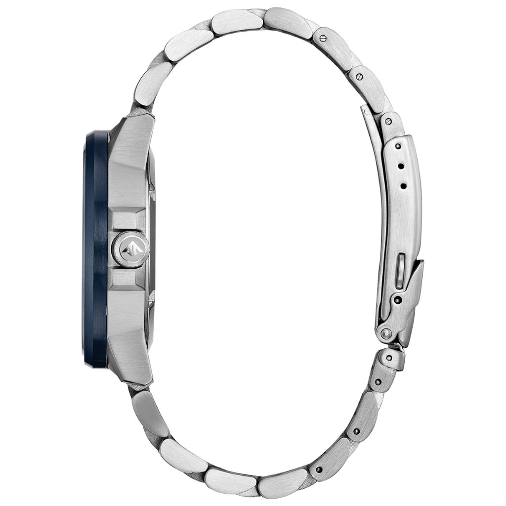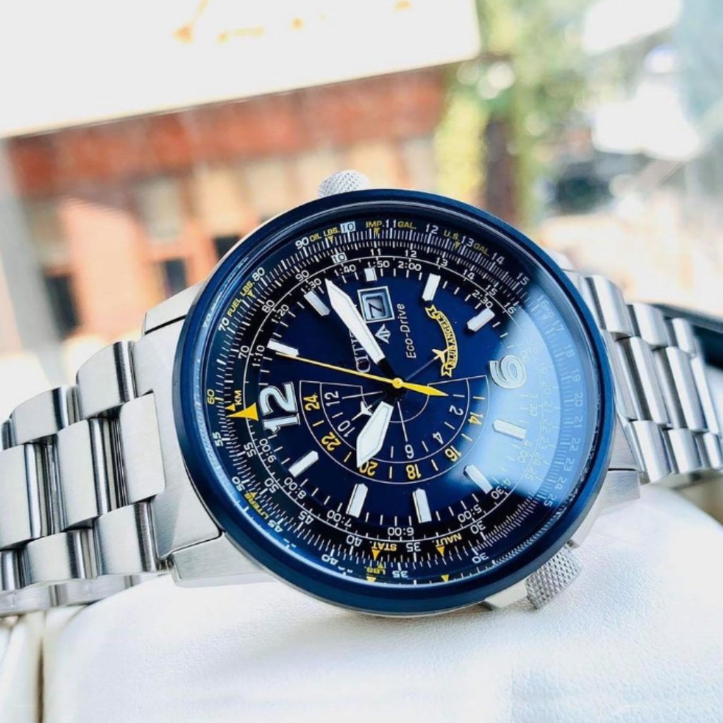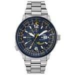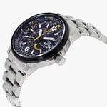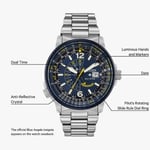 Inspired by the Navy’s elite flight demonstration squadron, the CITIZEN Blue Angels Nighthawk embodies precision, grace, and exceptional performance. With a navy blue ion-plated stainless steel case and bracelet, this watch boasts bright yellow accents on the navy blue dial, symbolizing the Blue Angels’ iconic colours. Powered by CITIZEN’s Eco-Drive Technology, this watch never requires a battery, running continuously on any light source. Key features include 12/14-hour time, a pilot’s rotating slide ring, date display, and dual time zone functionality for effortless travel.