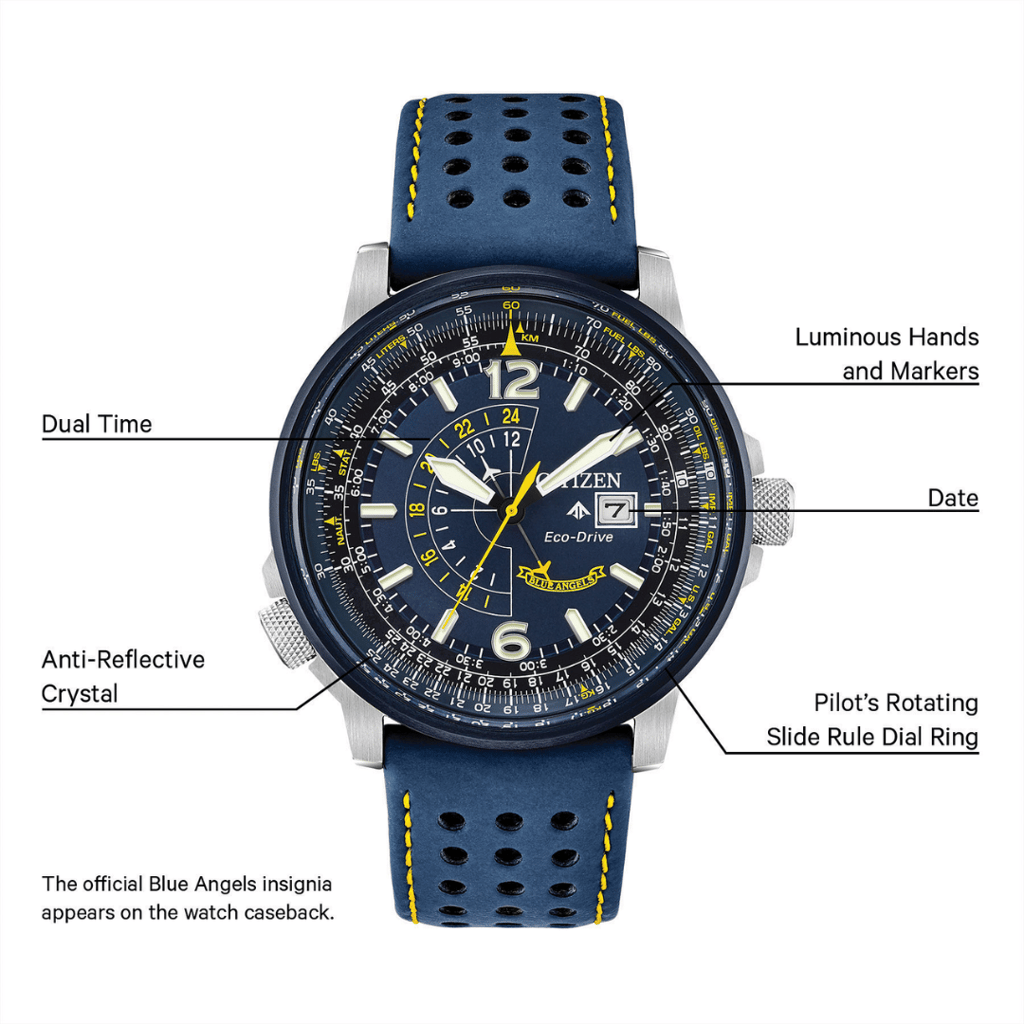 Inspired by the Navy’s elite flight demonstration squadron, the CITIZEN Blue Angels Nighthawk embodies precision, grace, and exceptional performance. With a navy blue ion-plated stainless steel case and leather strap, this watch boasts bright yellow accents on the navy blue dial, symbolizing the Blue Angels’ iconic colours. Powered by CITIZEN’s Eco-Drive Technology, this watch never requires a battery, running continuously on any light source. Key features include 12/14-hour time, a pilot’s rotating slide ring, date display, and dual time zone functionality for effortless travel.