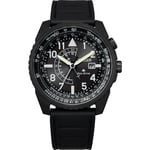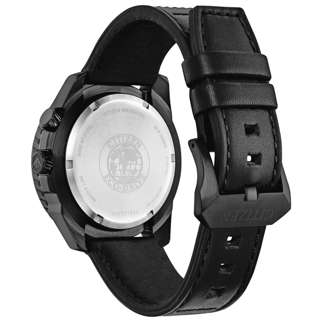Inspired by the sleek, clean lines of military stealth helicopters, the CITIZEN Nighthawk embodies precision, grace, and exceptional performance. With a black ion-plated stainless steel case and leather strap, and powered by CITIZEN’s Eco-Drive Technology, this watch never requires a battery, running continuously on any light source. Key features include 12/14-hour time, a pilot’s rotating slide ring, date display, and dual time zone functionality for effortless travel.
