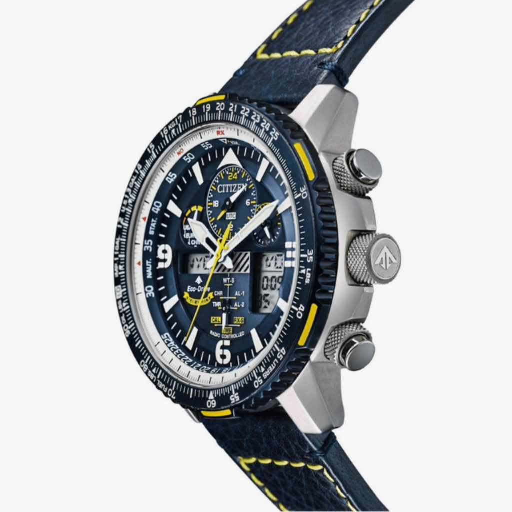 The blue dial and bezel, accented with yellow, reflect the iconic Blue Angels colors, while their insignia is proudly replicated on the caseback. Built with Eco-Drive technology, this watch is powered by any light source and never needs a battery. The stainless steel case and leather strap, paired with an anti-reflective sapphire crystal, make this watch both durable and stylish, suitable for both daily wear and professional use. Additional features include a digital backlight display, pilot’s rotating slide rule bezel, and 200m water resistance, making it ideal for swimming and snorkeling.