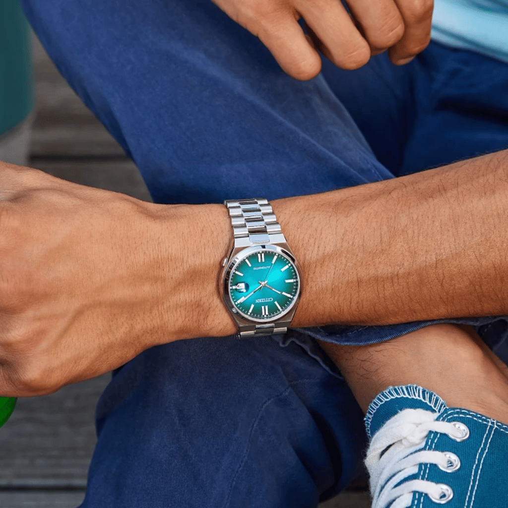 The Citizen Tsuyosa Automatic, part of the NJ015 series, delivers a perfect blend of modern sports styling and timeless elegance. With its versatile 40mm silver-tone stainless steel case and integrated matching bracelet, this timepiece makes a powerful statement, while remaining sleek enough for daily wear. Beneath the anti-reflective sapphire crystal, the blue glacier dial adds a pop of color, contrasted by silver-tone hands and markers for a sophisticated look. A date window at 3 o’clock ensures both style and function are in balance.