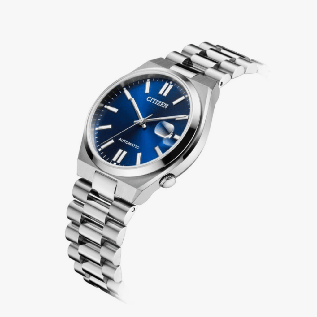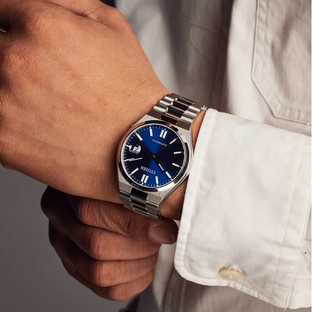 The Citizen Tsuyosa Automatic, part of the NJ015 series, delivers a perfect blend of modern sports styling and timeless elegance. With its versatile 40mm silver-tone stainless steel case and integrated matching bracelet, this timepiece makes a powerful statement, while remaining sleek enough for daily wear. Beneath the anti-reflective sapphire crystal, the blue sunray dial adds a pop of color, contrasted by silver-tone hands and markers for a sophisticated look. A date window at 3 o’clock ensures both style and function are in balance.