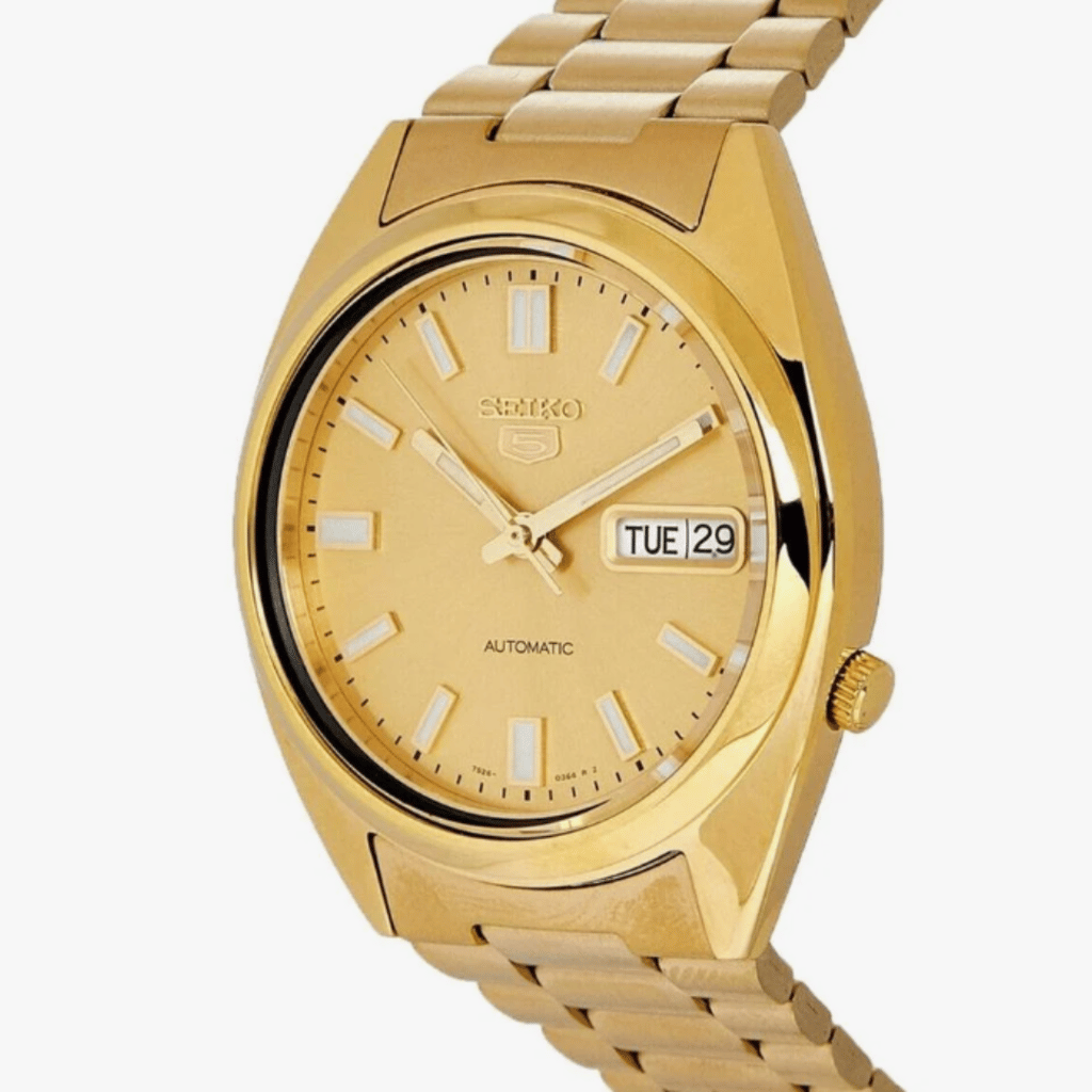 Seiko 5 Automatic – SNXS80K1 Was Now ZAR 5,000 Sale Elevate your style with this striking Seiko 5 Automatic, featuring an elegant full-gold design. The unisex appeal and automatic movement offer a perfect blend of luxury and practicality, making it ideal for both men and women seeking a timeless accessory.Movement: AutomaticCase size: 36 mmFunctions: Day, Date displayCrystal: Mineral glassWater resistance: 3 ATMDelivery contents: Watch, box & papersOther features: Display back, luminous hands & indices Quantity Enter an amount R Add to Cart Add to Cart
