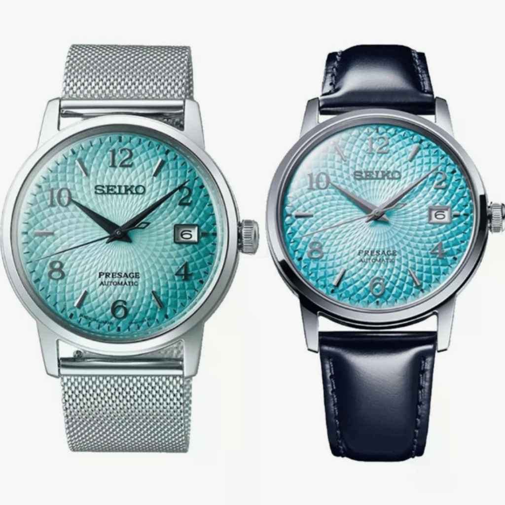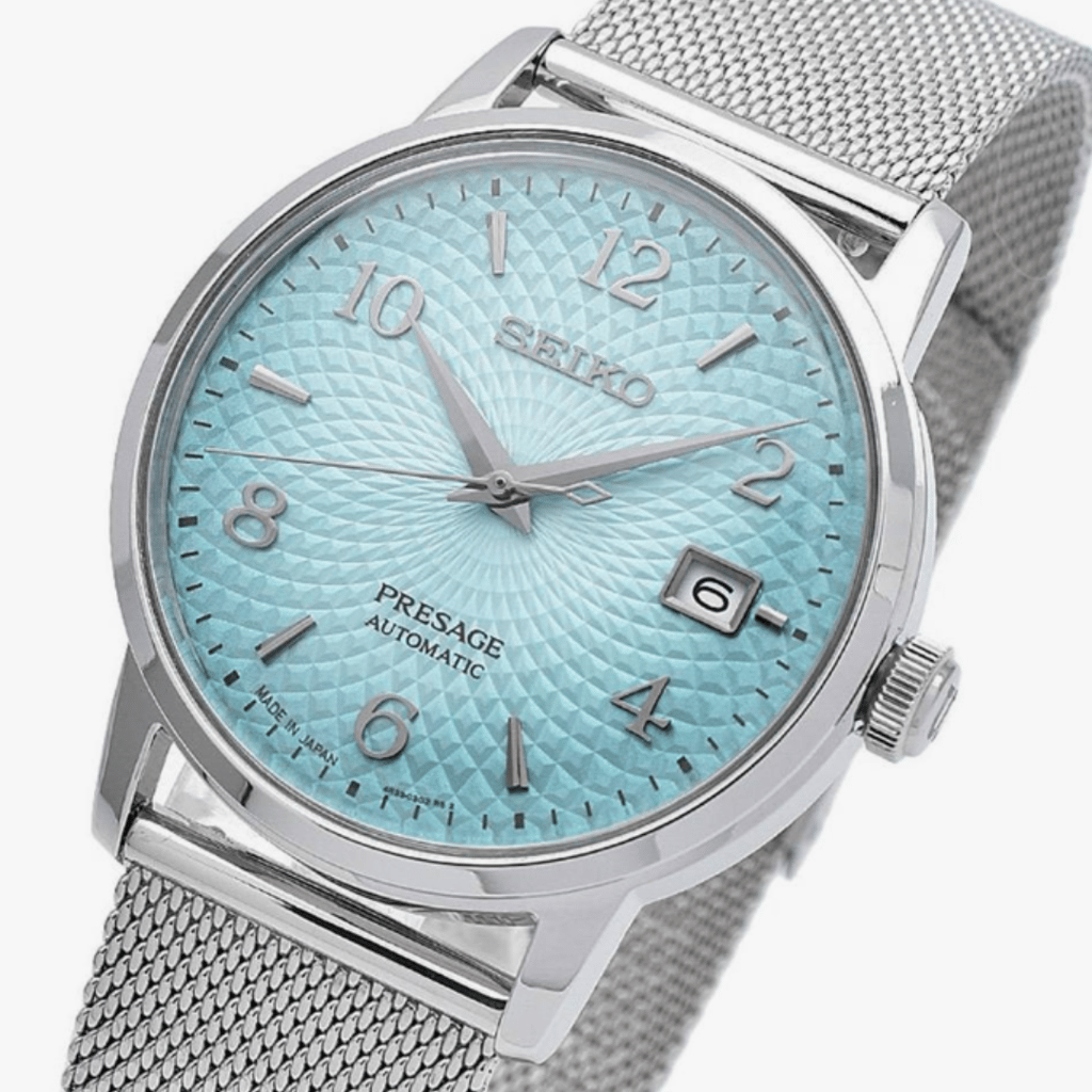 This Seiko Presage dress watch is the epitome of elegance and sophistication. Featuring a stunning baby blue textured dial, this timepiece blends traditional craftsmanship with modern design. The automatic movement ensures precise timekeeping, while the sleek, minimalist case makes it perfect for formal occasions.