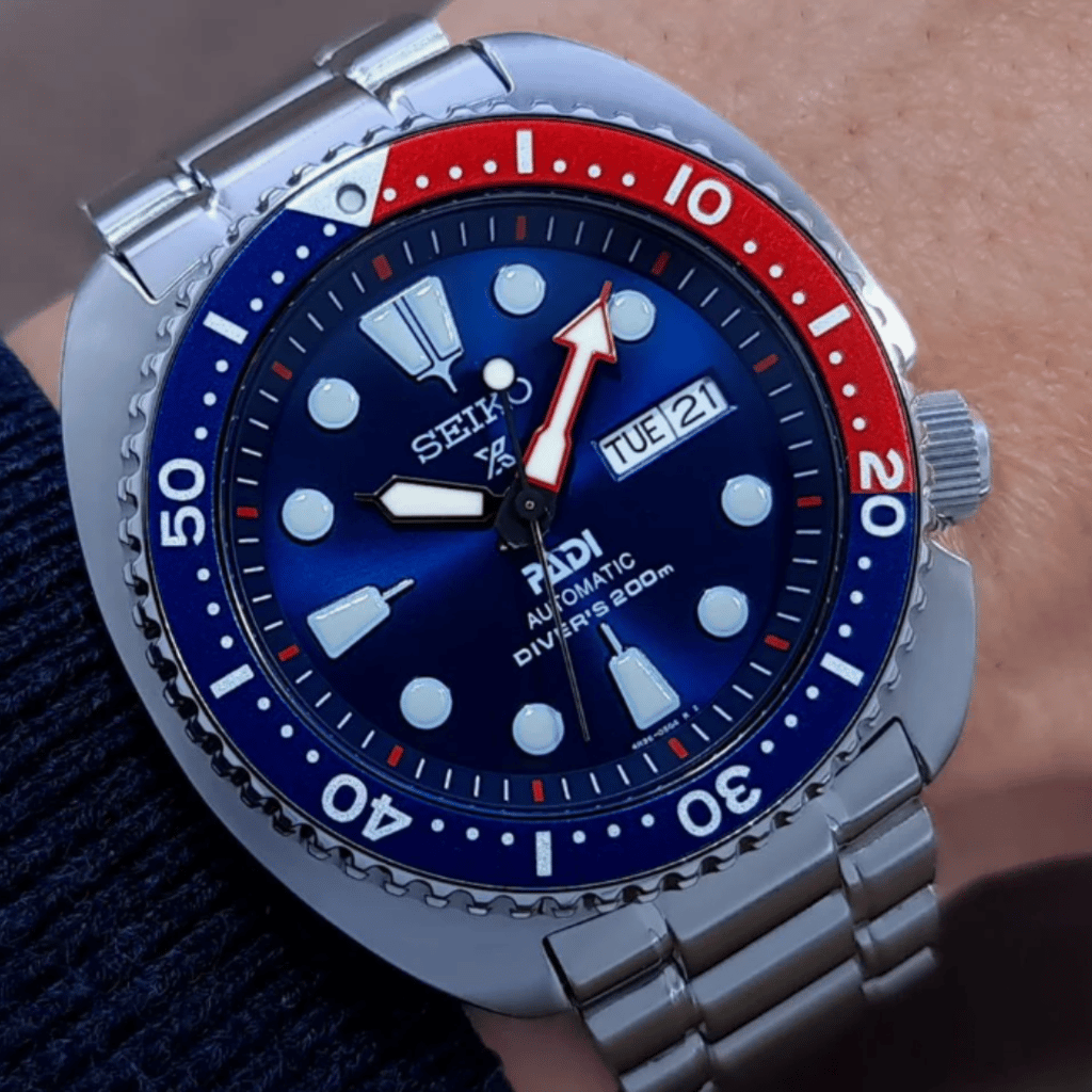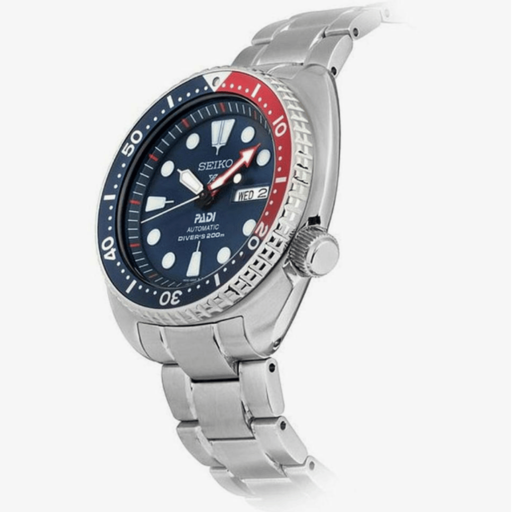 The Seiko Turtle PADI is an iconic diver’s watch, renowned for its bold design and exceptional functionality. Featuring the classic Pepsi bezel (red and blue), this watch is built for professional divers with 200 meters of water resistance. The large cushion-shaped case offers both comfort and durability, while the automatic movement ensures reliable, battery-free timekeeping. The luminescent hands and markers provide excellent visibility underwater, making it a trusted companion for your diving adventures.