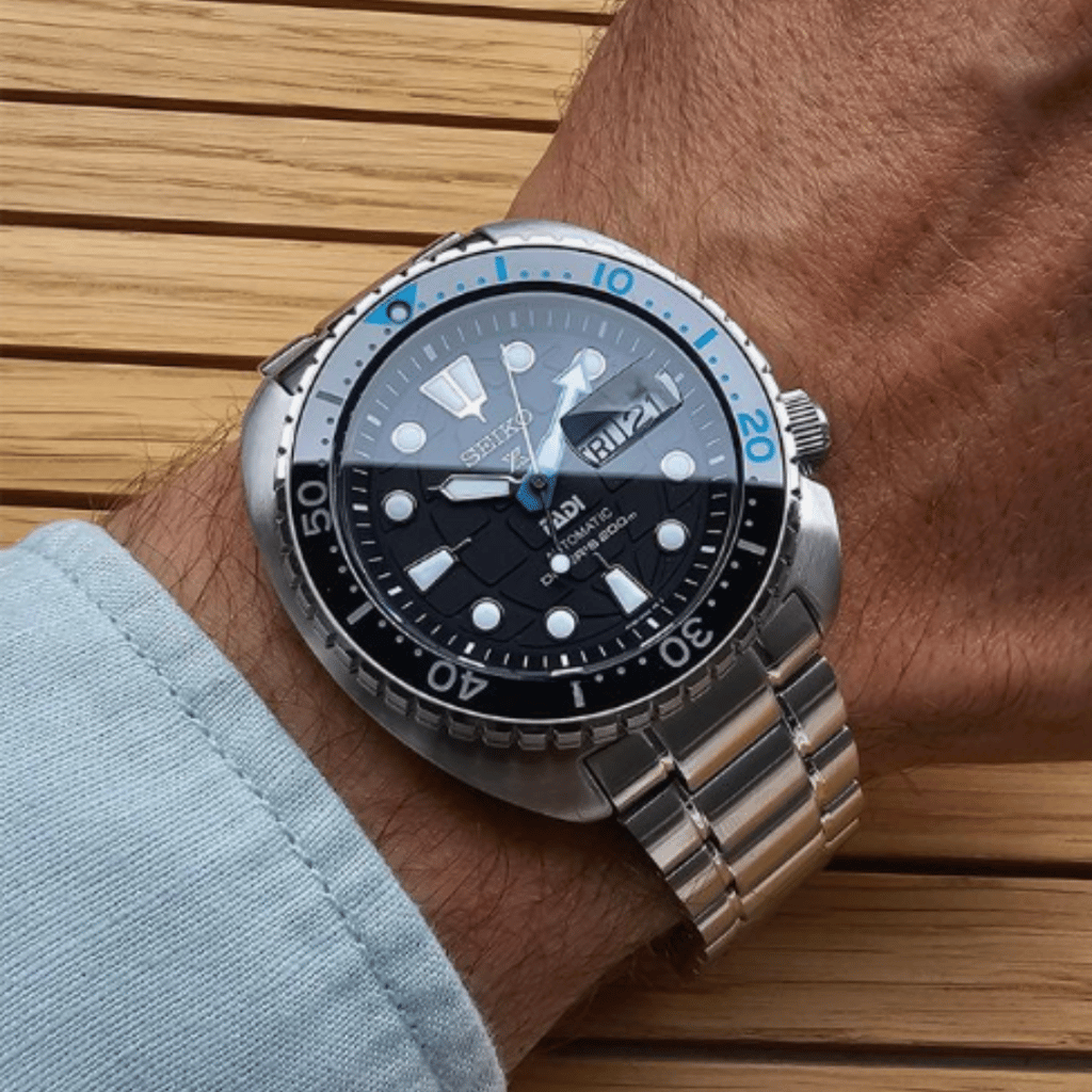 The Seiko Turtle PADI is an iconic diver’s watch, renowned for its bold design and exceptional functionality. This watch is built for professional divers with 200 meters of water resistance. The large cushion-shaped case offers both comfort and durability, while the automatic movement ensures reliable, battery-free timekeeping. The luminescent hands and markers provide excellent visibility underwater, making it a trusted companion for your diving adventures. Nicknamed the Sea King, this striking watch owns the ocean!