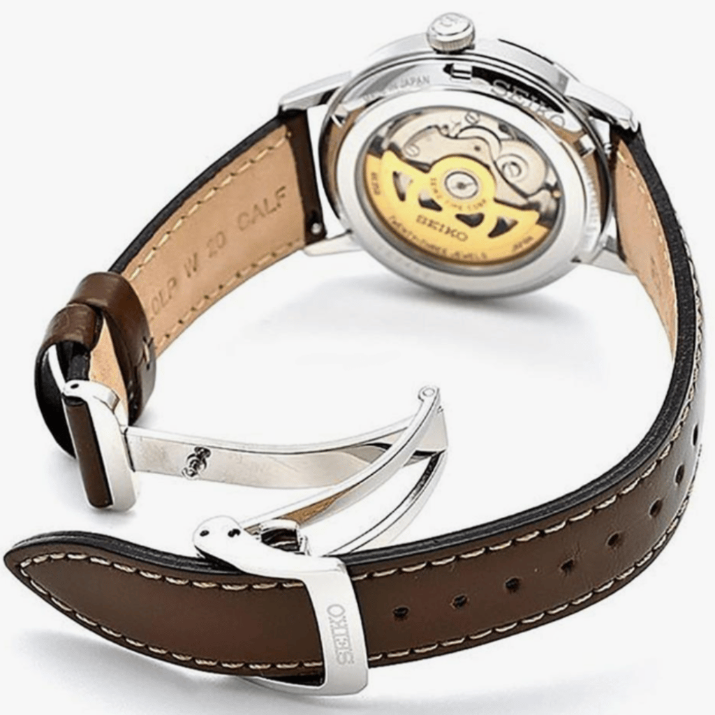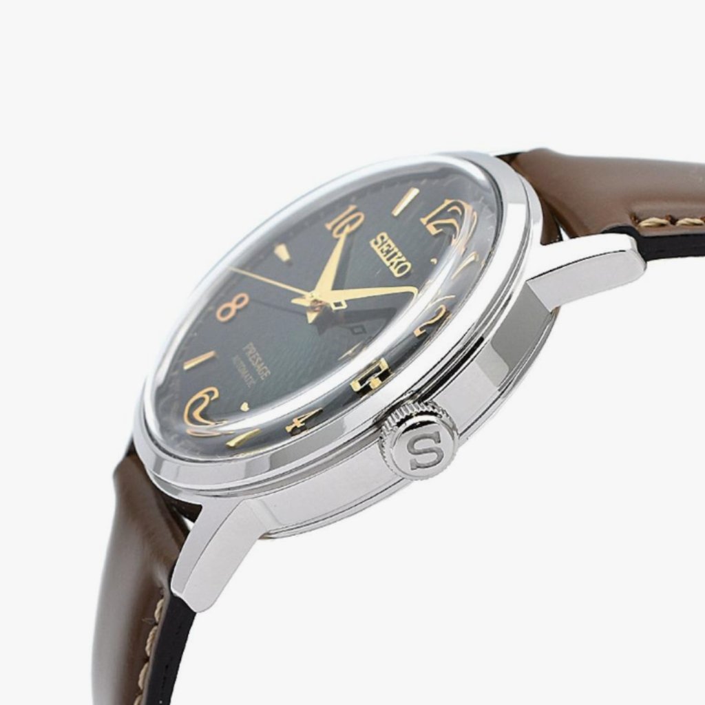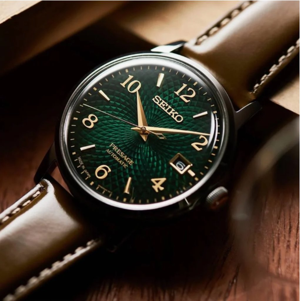 Seiko Presage – SRPE45J1 Was Now ZAR 9,000 Sale This Seiko Presage dress watch is the epitome of elegance and sophistication. Featuring a stunning green textured dial, this timepiece blends traditional craftsmanship with modern design. The automatic movement ensures precise timekeeping, while the sleek, minimalist case makes it perfect for formal occasions.Movement: AutomaticCase size: 38.5 mmFunctions: DateCrystal: Mineral glassWater resistance: 5 ATMDelivery contents: Watch, box & papersOther features: Display back Quantity Enter an amount R Add to Cart Add to Cart