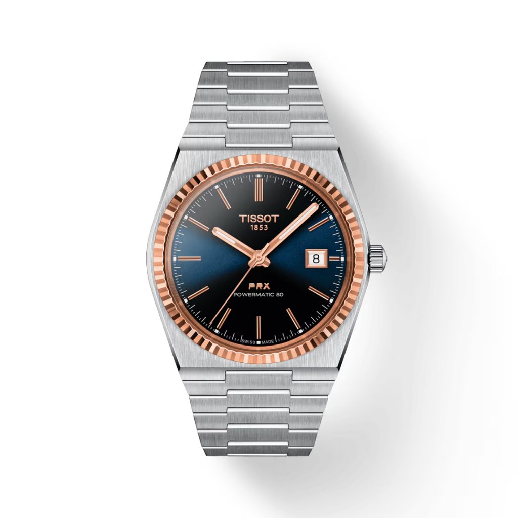 One of the most popular watches of the decade! The Tissot PRX Powermatic 80 blends modern innovation with a vintage-inspired design that harkens back to Tissot’s 1978 heritage. This refined 40mm stainless steel timepiece is powered by the Swiss automatic Powermatic 80 movement, offering an impressive 80-hour power reserve. The striking blue dial and 18K Gold bezel adds a bold yet elegant touch, making this watch perfect for both formal and casual occasions.